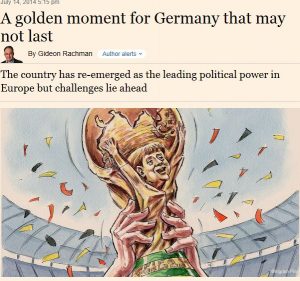 Saksan Kultainen hetki ei ehkä kestä (A golden moment for Germany that may not last.) kirjoittaa Gideon Rachman FT:ssä 14.7.2014 Saksan on tapana voittaa maailmanmestaruus symbolisina hetkinä. Voitto 1954 –…