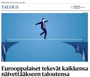 Lainaan osuvaa Samuli Niinivuon kirjoitusta , HS 22.10.2024 Yhteisvelan kammo ja maahanmuuttovastaisuus saavat eurooppalaiset näyttämään entisaikojen ihmisiltä. Käytännössä siis eurooppalaisilla on vallitsevassa tilanteessa kaksi vaihtoehtoa, mikäli he mielivät kohentaa taloutensa…