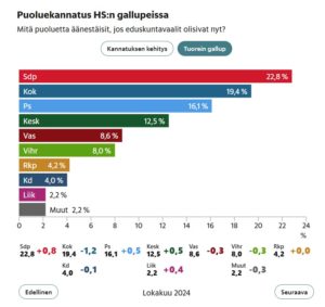 Hesarin pääkirjoitus 20241018: Matkan rasitukset alkavat tuntua hallituspuolueiden kannatuksessa, käy ilmi eduskuntavaalikannatusta mittaavasta Helsingin Sanomien kyselystä. Kokoomuksen kannatus on pudonnut kuukauden takaisesta peräti 1,2 prosenttiyksikköä. Sdp:n kannatus on puolestaan noussut…