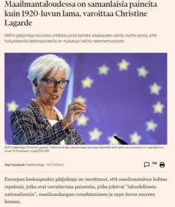 https://www.ft.com/content/33a44142-3b60-49c5-89d9-2f27b5c30b7f Kyllä otsikko pakotti lukemaan EKP:n pääjohtajan jutun heti. Kyllä – aikoja elämme , pelottavia suorastaan ja yhtäläisyys silloiseen ja sen seurauksista panee miettimään emme kö ole mitään oppineet. Lue…