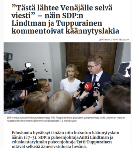 Nyt on politikoinnin teon aika ohi. Presidentti ja valtioneuvosto ovat vastuussa. Olkaa viisaita! Antti Lindtmanin mukaan lain käsittely ei ole ollut SDP:lle helppoa siksi, että siinä on pyritty sovittamaan yhteen…