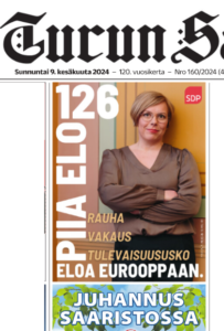Turun Sanomien etusivun juttu on Piia Elon mainos: Tulevaisuususkon, rauhan ja vakauden asia vaatii ääniä. Äänestetään tällä kerralla Euroopan parlamenttiin varsinais-suomalainen pätevä nainen