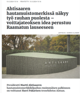 Martti Ahtisaaren muistomerkki ei paljon sanoja kaipaa; se on kaunis ja osuva – onnistunut. Lainaan kuitenkin aiheesta sanotun, joka liittää evankelisien sanoman maailman nykyisyyteen vääryyteen. Samassa yhteydessä, jossa Jeesus julistaa…