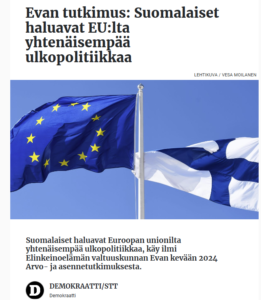 Kun nyt tosipaikan tullen suomalaiset alkavat ymmärtää yhteisen Euroopan merkityksen. EVA:n asennetutkimukset kertovat, että suomalisten asenne EU:n olemassaoloon ja Unioniin kuulumiseen an lisännyt kannatusta ja kielteinen suhtautuminen on vähenemässä. Selvää…