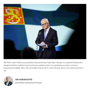 Olli Rehn rakentaa yhteistyötä, mutta sitäkin merkittävämpää on, että Olli Rehn herättää vähemmän vastustusta. Hänestä on koko kansan presidentiksi. Kun sanon presidentin oloinen Olli, en tarkoita harmaantunutta tukkaa enkä harkittua…