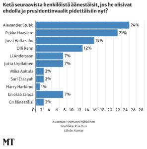 Odotettu gallup on nyt tiedossamme. Yle uutiso: Maaseudun Tulevaisuuden presidenttikyselyssä eniten kannatusta saa kokoomuksen presidenttiehdokas Alexander Stubb. Hänen kannatuksensa on 24 prosenttia. Kannoilla oleva valitsijayhdistyksen ehdokas ja vihreiden tukema Pekka Haavisto kerää 21…