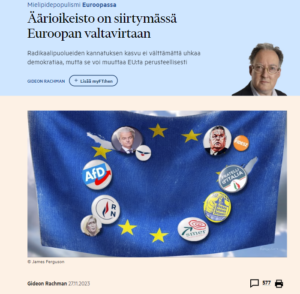 Oikeistopopulismi on menestynyt hyvin vaaleissa. Tätä aihetta analysoi oheisessa artikkelissa Gideon Rachman https://www.ft.com/content/8384228d-8156-4134-8eb4-035c068704b9 Hänen kolumninsa loppuu: Äärioikeisto on myös poikkeuksetta vihamielinen EU:ta kohtaan, jota se luonnehtii elitistiseksi ja ”globalistiseksi” hankkeeksi,…
