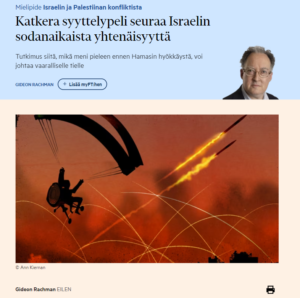 Israel ja Palestina ”viha vaino pois rauha parempi ois” on turha toivo. Ja taas hyödyn saavat ääriainekset; Putin on täyttyväinen ja taitaa olla niin, että Eurooppakin kääntyy sisäänpäin kuten Saksan…