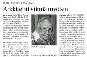 Riitta Thuneberg oli, kuten muistokirjoituksessa todetaan, ytimiään myöten arkkitehti. Hän ymmärsi kulttuurihistoriaa ja Naantalia niin, että monien vuosien aikana on ilo nähdä hänet kujillamme. Työkohteesta oli tullut hänelle läheinen. Muistan,…