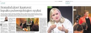 Mielikuvat ja todellisuus TS 7.4.2023 Jenni Leppärinne kirjoittaa artikkelissaan ”Romahdukset kaatuvat lopulta puheenjohtajien syyksi” Keskustan tappiosta näin: ”Lopulliseksi naulaksi arkkuun ilmaantui Sanna Marinin (sd) vasemmistolainen hallitus, jonka politiikka repi keskustaa liikaa vasemmalle…