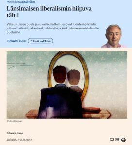 Edward Luce FT Liberalismi hiipuva tähti https://www.ft.com/content/c2bcf288-afb6-4b24-8107-c483c3394c74 Hydrauliikan lait ovat rikottu. Donald Trumpin kannatusluvut ovat laskeneet toisen kauden pohjalukemiin, mutta demokraattipuolueen kannatus on laskenut vielä enemmän. Niiden pitäisi olla nousussa….