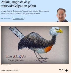 AUKUS = AU + UK + USA Emun, punarinnan ja merikotkan risteytys Kiihtyy , kiihtyy varustelua lisätään; Eli uusi liittoutuma ydinsukellusveneineen Kiinaa vastaan on toisella pallonpuoliskolla ja kuitenkin niin…