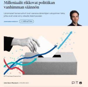 Maailma on muutoksessa. Usein suuntaukset lähtevät liikkeelle lännestä anglo-maailmasta ja tulevat sitten tänne Euroopan reunalle. Artikkelikuvan otsikolla kirjoittaa FT:ssä John Burn-Murdoch : ”Jos et ole liberaali 25-vuotiaana, sinulla ei ole…