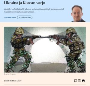 – Joillekin konservatiiveille jokainen ulkopoliittinen kriisi on ”München”. Joidenkin vasemmistolaisten mielestä jokainen sota uhkaa muuttua ”Vietnamiksi”. Mutta kun Ukrainan sota siirtyy väistämättä toiseen konfliktivuoteen, vähemmän yleinen analogia kiertää – Korea….
