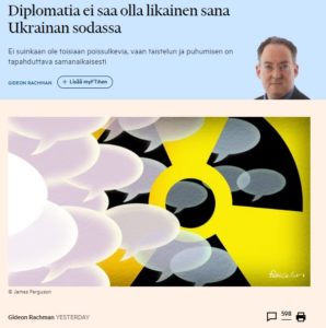 Vuonna 1962 ydinvoiman torjunta tapahtui salaisen diplomatian taustalla, joka lopulta purki Kuuban ohjuskriisin. Tällainen diplomaattinen toiminta on puuttuva ainesosa Ukrainan sodassa. Suuri virhe on uskoa, että diplomatia on vaihtoehto vahvalle…