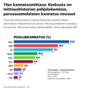 Ylen tuoreen kannatusmittauksen mukaan keskustaa äänestäisi 10,3 prosenttia puoluekantansa kertoneista. Laskua edellisestä mittauksesta on 1,4 prosenttiyksikköä. Puolueen kannatus on alimmillaan kannatusmittauksia tekevän Taloustutkimuksen arkistojen ajalta. Arkistot yltävät vuoteen 1994 asti….